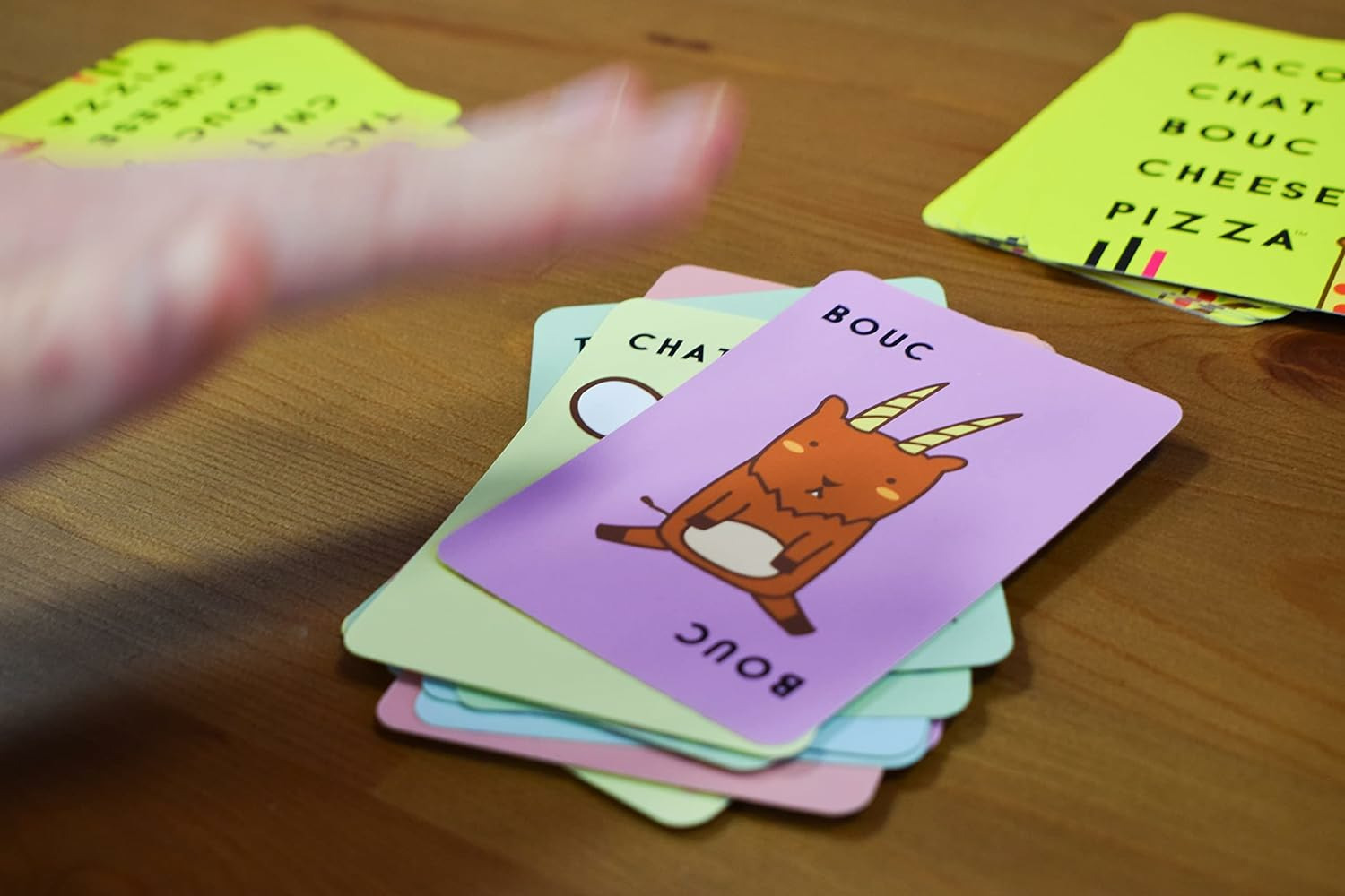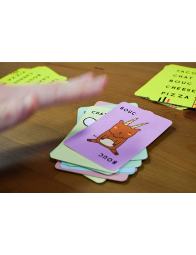 Gardez bien ces 5 mots loufoques en tête. Dès qu’une carte correspondant au mot annoncé est révélée, tapez la pile centrale. Le dernier ramasse tout ! Soyez observateurs et vifs pour vous débarrasser de toutes vos cartes ! La moindre erreur vous coûtera des cartes de pénalité : ni feinte, ni approximation dans ce jeu de défausse complètement frénétique et farfelu.