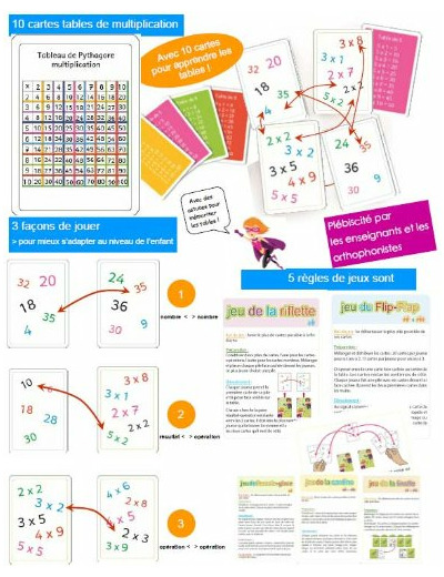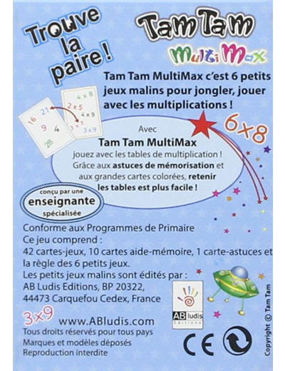 Le joueur doit retrouver l’unique paire qui existe entre deux cartes: une carte-nombres et une carte opérations. TAM TAM Multimax Niveau 1 renforce la mémorisation des tables de multiplication de X2 à X5 (programme CE1). Chaque table est représentée sur une carte de couleur qui facilite la mémorisation. Des astuces de mémorisation sont expliquées. Le jeu propose 3 façons de jouer pour mieux s'adapter au niveau de l'enfant : nombre/nombre, opération/résultat, opération/opération.