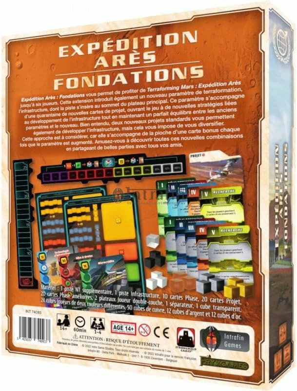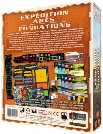 Expédition Arès : Fondations vous permet de profiter de Terraforming Mars : Expédition Arès jusqu’à six joueurs. Cette extension introduit également un nouveau paramètre de terraformation, l’infrastructure, dont la piste s’insère au sommet du plateau principal. Ce paramètre s’accompagne d’une quarantaine de nouvelles cartes de projet, ouvrant le jeu à de nouvelles stratégies liées au développement de l’infrastructure tout en maintenant un parfait équilibre entre les anciens paramètres et le nouveau. Bien entendu, deux nouveaux projets standards vous permettent également de développer l’infrastructure, mais cela vous impose de vous diversifier. Cette approche est à considérer, car elle s’accompagne de la pioche d’une carte bonus chaque fois que le paramètre est augmenté. Amusez-vous à découvrir toutes ces nouvelles combinaisons en partageant de belles parties avec tous vos amis.