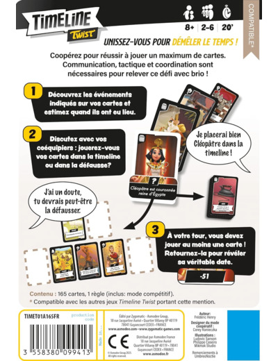 Timeline devient désormais aussi un défi coopératif ! Piochez 35 cartes à chaque partie, puis réfléchissez, communiquez et coordonnez-vous pour les poser dans le bon ordre, tout en défaussant les plus gênantes. Essayez d’obtenir le meilleur score possible à chaque nouvelle partie.
