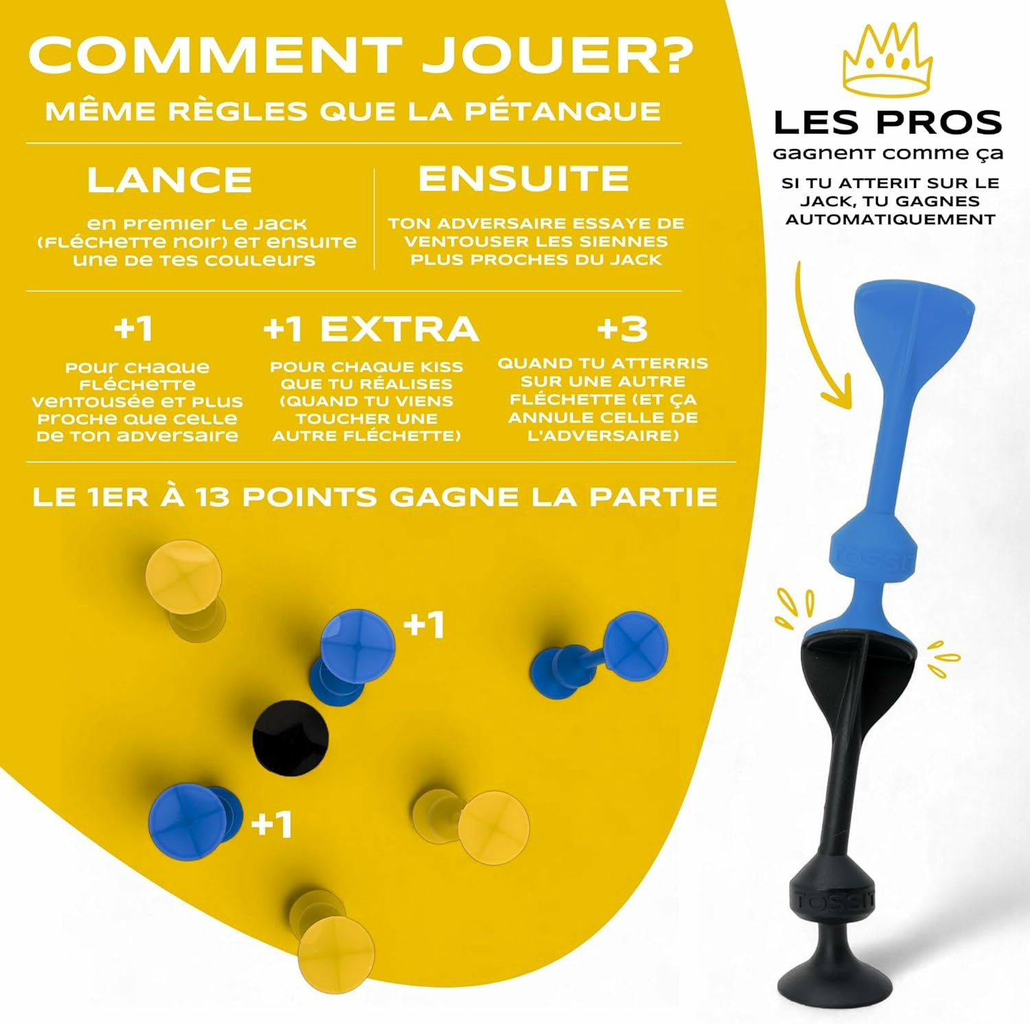 Le jeu TOSSIT est un mix ingénieux et fun entre les fléchettes, la pétanque, et le molkky. Pour jouer à l’intérieur ou l’extérieur, des règles pour des parties en famille et d’autres pour les soirées entre amis. Les fléchettes utilisées sont souples, munies d’une ventouse puissante et résistante pour coller sur de nombreuses surfaces lisses. Conçu en France.