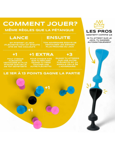 Le jeu TOSSIT est un mix ingénieux et fun entre les fléchettes, la pétanque, et le molkky. Pour jouer à l’intérieur ou l’extérieur, des règles pour des parties en famille et d’autres pour les soirées entre amis. Les fléchettes utilisées sont souples, munies d’une ventouse puissante et résistante pour coller sur de nombreuses surfaces lisses. Conçu en France.