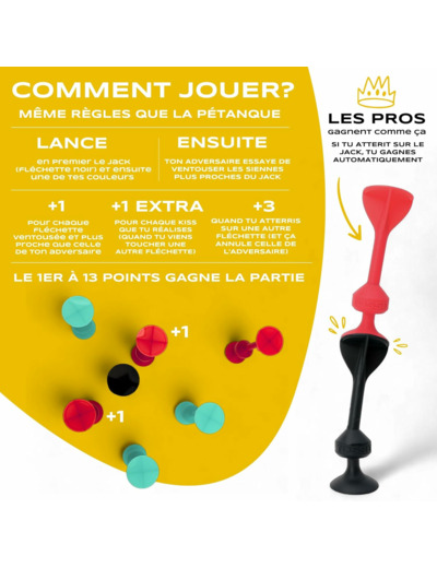 Le jeu TOSSIT est un mix ingénieux et fun entre les fléchettes, la pétanque, et le molkky. Pour jouer à l’intérieur ou l’extérieur, des règles pour des parties en famille et d’autres pour les soirées entre amis. Les fléchettes utilisées sont souples, munies d’une ventouse puissante et résistante pour coller sur de nombreuses surfaces lisses. Conçu en France.
