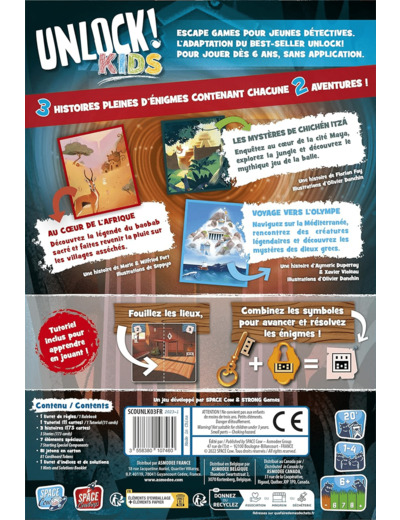 Trois histoires pour six nouvelles aventures qui entrainent enfants et parents en Afrique, chez les Mayas et vers l’Olympe ! Cette version d’Unlock! est totalement pensée et conçue pour les enfants à partir de 6 ans : ni calculs, ni textes, ni écran, ni connexion, elle fait la part belle au plaisir et à la réflexion.