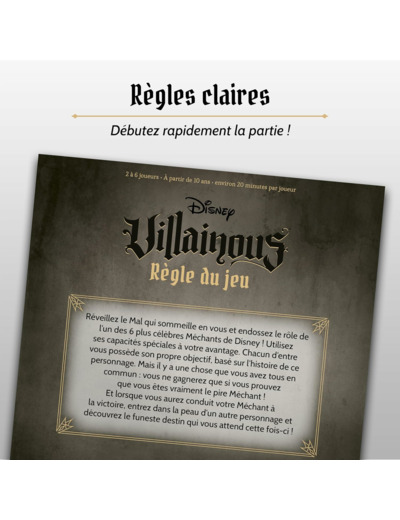 Car ce n’est qu’en dictant avec succès vos règles aux héros de Disney que vous pourrez espérer une fin… malheureuse ! Tout comme dans les films, aucun Méchant ne se ressemble : chaque univers est fidèlement transposé grâce à des cartes propres à chaque Méchant et un objectif personnel. L’immersion est totale, que vous essayez de maudire le royaume en tant que Maléfique ou de devenir le plus riche avec le Prince Jean, chaque partie sera différente que ce soit au niveau de votre stratégie, des pouvoirs de vos cartes ou du but à atteindre. Mais que serait un Méchant sans sa némésis ? Chaque Méchant a un deck de cartes Fatalité que les autres joueurs utiliseront contre lui : des héros de Disney comme Ariel, Peter Pan, Aladdin ou encore Robin des bois viendront alors perturber vos plans, utilisant des objets, comme la poudre de fée, la lampe merveilleuse, et toutes sortes de ruses et d’effets.