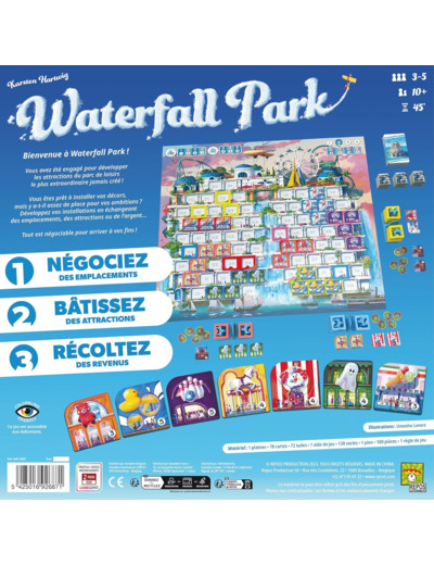 À la fin de chaque phase, vos bâtiments, complets ou incomplets, rapportent des revenus. Deviendrez-vous le plus riche bâtisseur de Waterfall Park à la fin du quatrième round ?