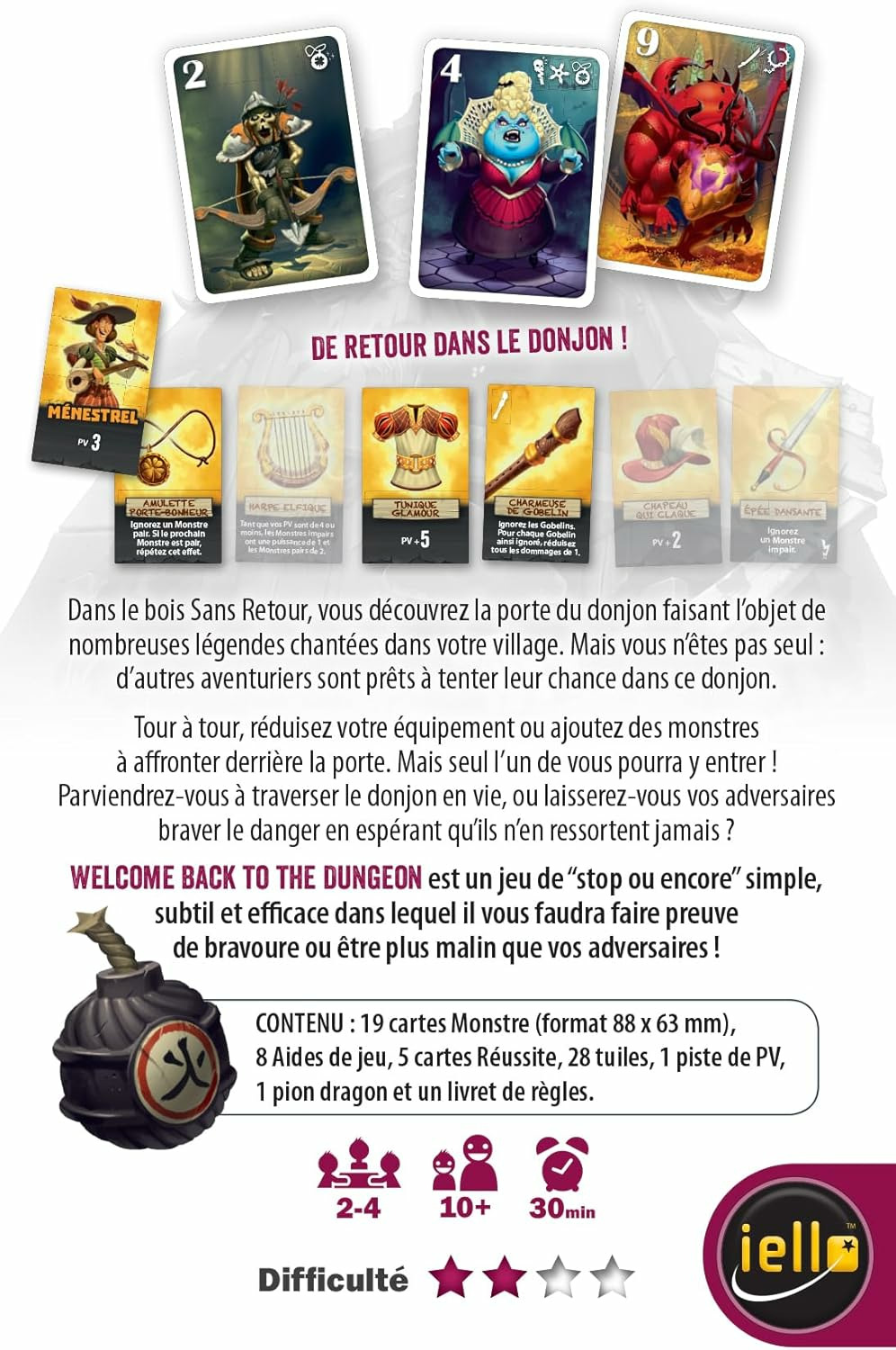 Depuis que 4 inconscients se sont essayés à entrer dans le terrible Donjon du bois Sans Retour, l’histoire a fait le tour du royaume. Nombreux sont alors les fous qui ont voulu reproduire cet exploit, sans jamais en ressortir vivants… enfin, jusqu’à aujourd’hui ! 4 nouveaux aventuriers se dressent face à ce donjon, dont la réputation fait trembler dans les chaumières ! Fiers, fous ou courageux, ils sont bien décidés à en découdre avec les habitants de ce terrible lieu… ou peut-être pas tant que ça, finalement ! Ce qu’ils ignorent, c’est que de nouveaux monstres encore plus puissants ont fait leur apparition et ont faim … Très faim !