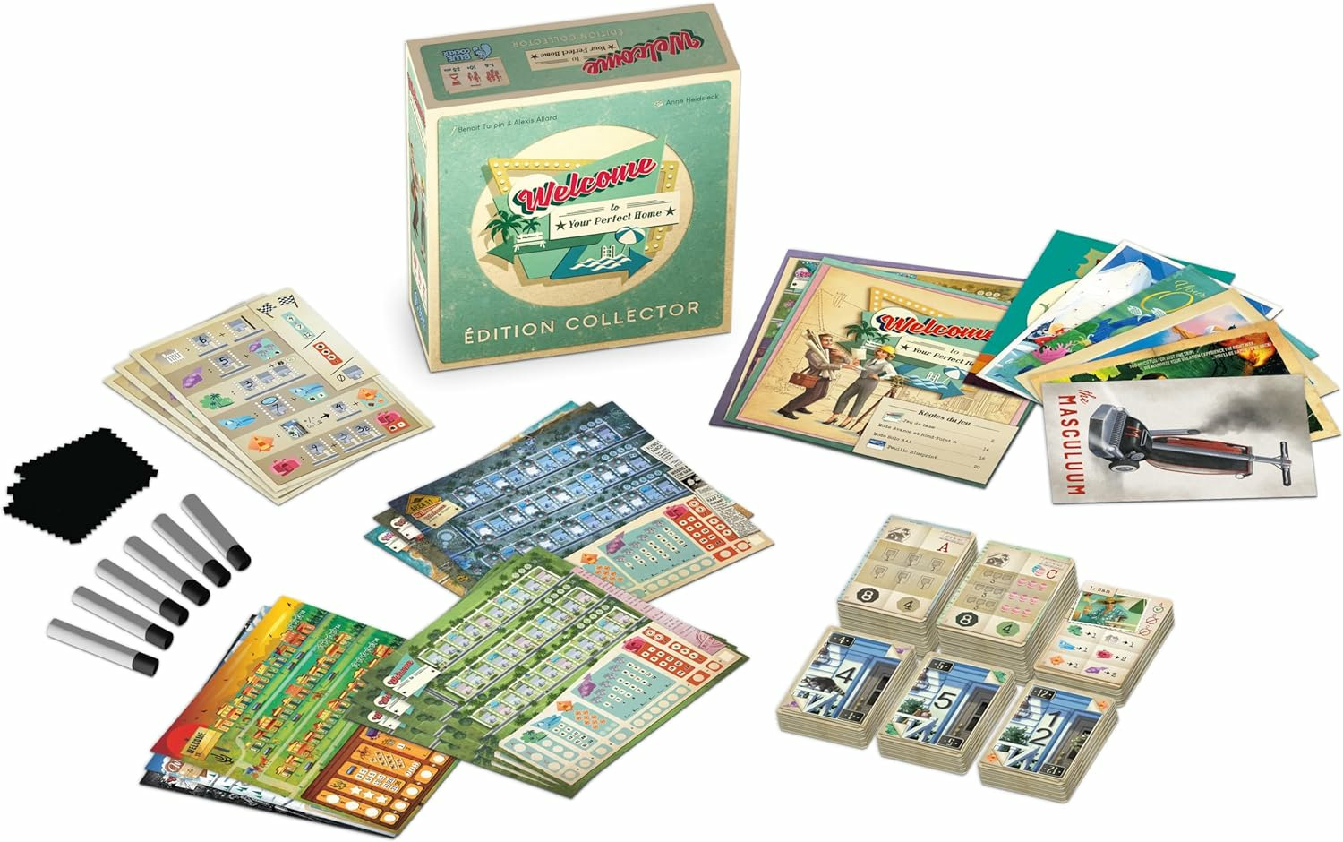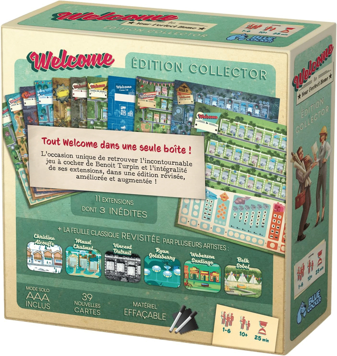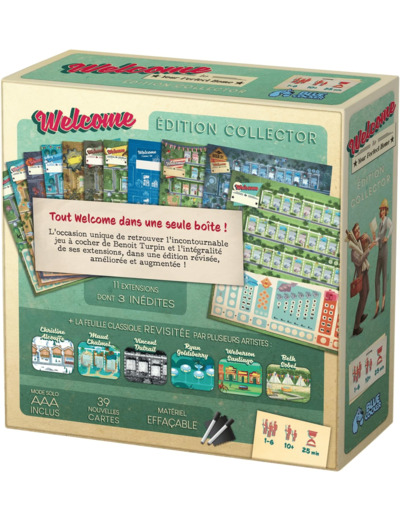 Le fameux flip&write revient dans une édition Collector proposant l'intégralité de la gamme Welcome to your Perfect Home plus 3 extensions, un mode solo pour chaque version, 35 cartes Objectif et 3 cartes Travaux inédits, tout cela avec feutres et fiches effaçables.