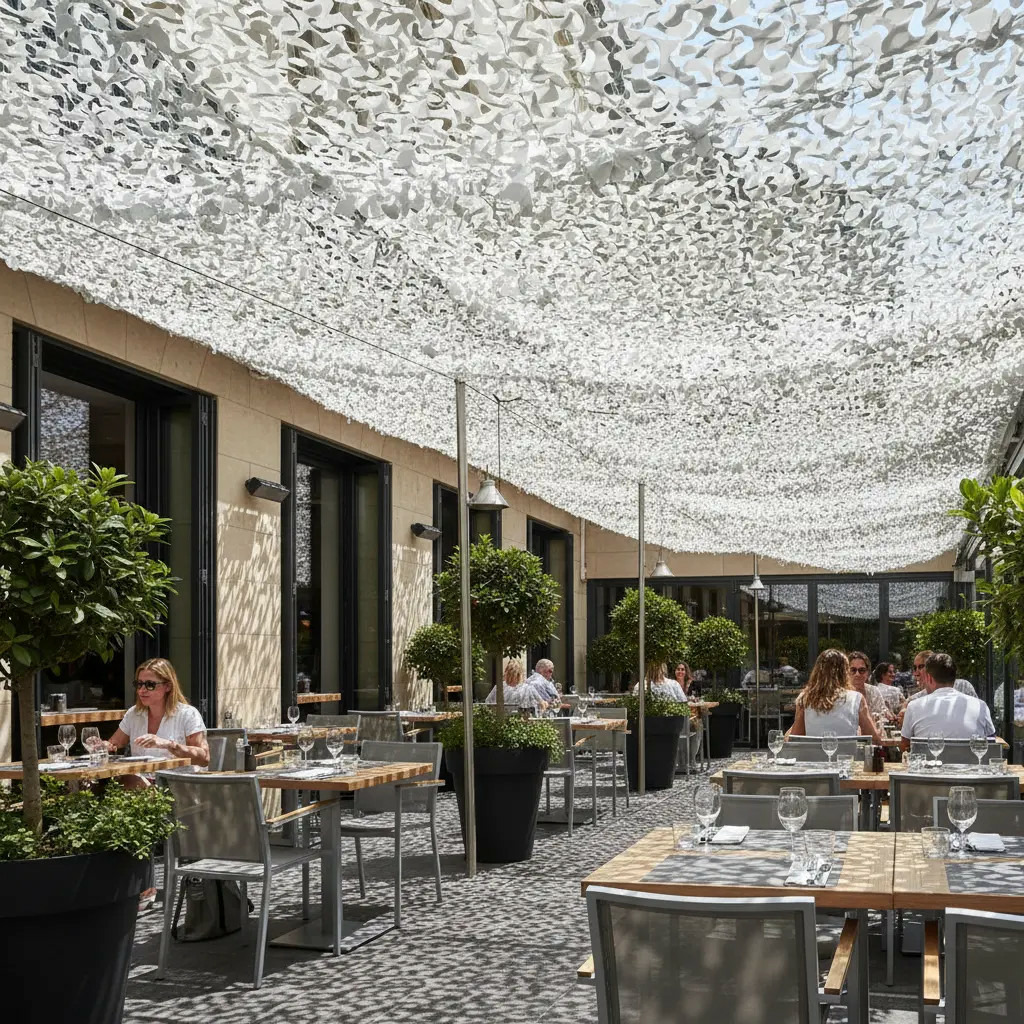 Grâce à sa découpe S-Cut 3D, ce filet camouflage blanc dissimule intelligemment la structure tout en laissant passer une lumière douce. Renforcé et réversible, il s'oriente selon l'angle de vue pour s'adapter à chaque pergola moderne et mobilier clair, sans alourdir l'esthétique de votre espace extérieur ombragé.