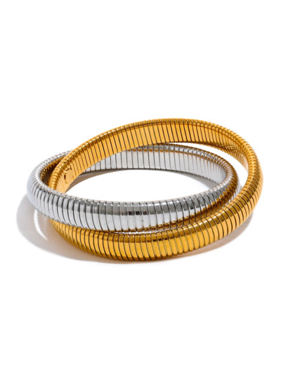Un bijou d'une grande élégance, parfait pour celles qui aiment mélanger les métaux. Ce bracelet entrelacé combine des bandes dorées et argentées, créant un effet visuel sophistiqué et moderne. Sa conception en acier inoxydable assure une durabilité à long terme, tout en ajoutant une touche de luxe à votre poignet. Ce jonc est idéal pour compléter à la fois des tenues de tous les jours et des looks plus habillés. Disponible sur la bijouterie en ligne par TMB, c'est un accessoire polyvalent pour toutes les garde-robes.