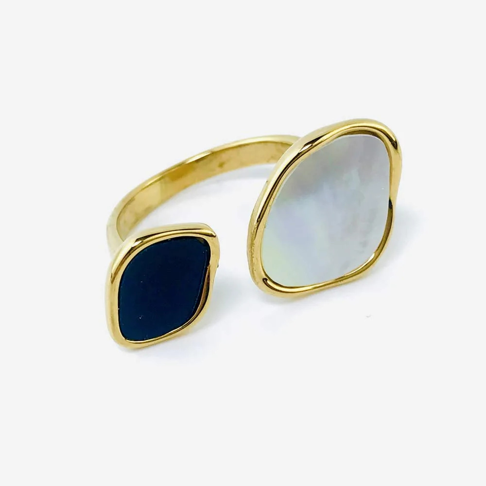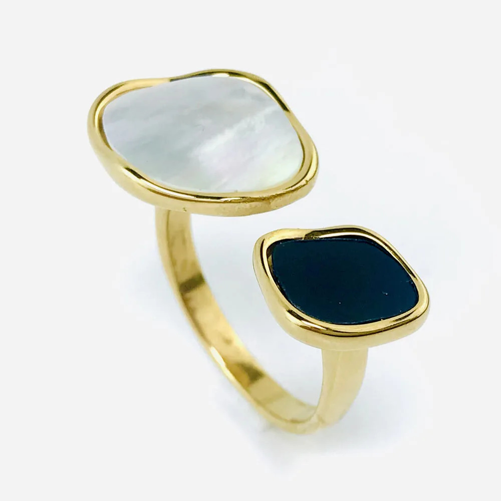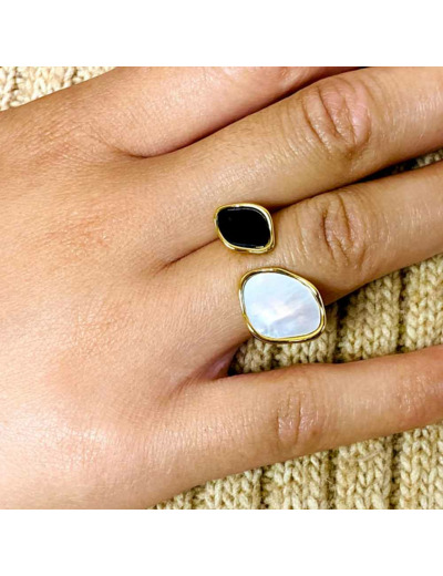 Cette bague originale créateur s'inspire du style CANYON. Le design ajustable en plaqué or est subtilement ajouré, donnant naissance à deux pointes bien distinctes. Celles-ci sont ornées de touches de nacre noir et blanche, apportant une dimension supplémentaire de luxe et de mystère. La couleur du métal sublime le contraste entre le noir et le blanc, faisant de cette bague une marque d'élégance. Que vous choisissiez de la porter au doigt annulaire ou à un autre doigt, elle reste un choix idéal. Vous pouvez acheter ou commander cette pièce exquise comme une idée cadeau parfaite pour la femme audacieuse et élégante dans votre vie. Chaque élément s'harmonise parfaitement, créant une œuvre d'art portable que vous ne voudrez pas manquer.