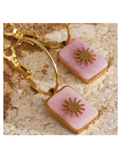 • Très belles boucles d’oreilles originales et tendances doré à l’or fin jaune avec une pierre naturelle rose (agate rose) gravée d’un soleil d’or fin plaqué 18k