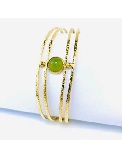 Un bracelet jonc pour femme à double rangs. Ce bijou est martelé pour un effet texturé et ajouré pour une touche de finesse. Réalisé en acier inox doré et plaqué en or fin 18 carats, ce bracelet allie robustesse et élégance. Il est orné d'une pierre naturelle d'agate verte, ajoutant une dimension unique au design.