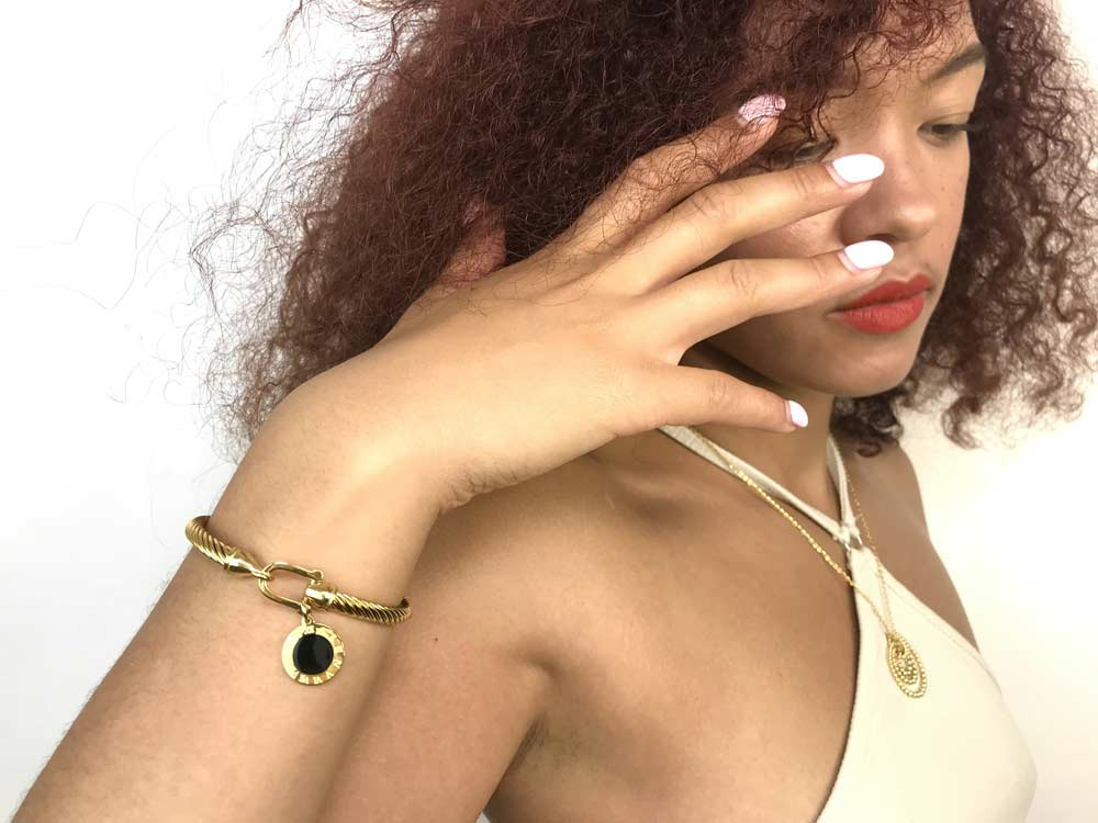 Ce bijou est orné d'un petit médaillon en or, rehaussé par des chiffres romains gravés autour, conférant une sophistication intemporelle. Le médaillon est agrémenté d'un rond de nacre noire en son milieu, apportant un contraste saisissant et une beauté mystérieuse. Cette conception unique et le design torsadé font de ce bracelet un choix parfait pour les femmes qui apprécient l'élégance et le détail. Que ce soit comme un cadeau précieux pour une occasion spéciale ou pour sublimer le quotidien, ce bracelet est un véritable hommage à la féminité.
