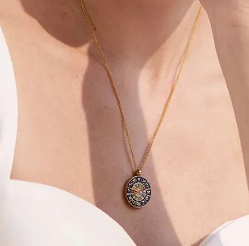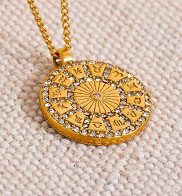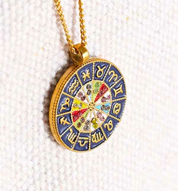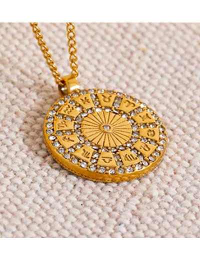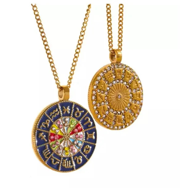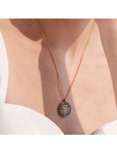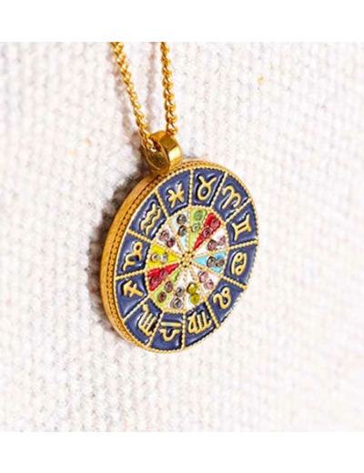 La première face affiche les symboles du zodiaque, magnifiquement colorés et arrangés autour d'un motif central éclatant sur un fond bleu profond. La seconde face est dorée, ornée de symboles gravés entourés d'un cercle de pierres scintillantes, ajoutant une touche de luxe et de mystère. Ce bijou est parfait pour celles qui souhaitent porter un accessoire à la fois symbolique et élégant, apportant une touche personnelle et significative à n'importe quelle tenue. Un véritable chef-d'œuvre de style.