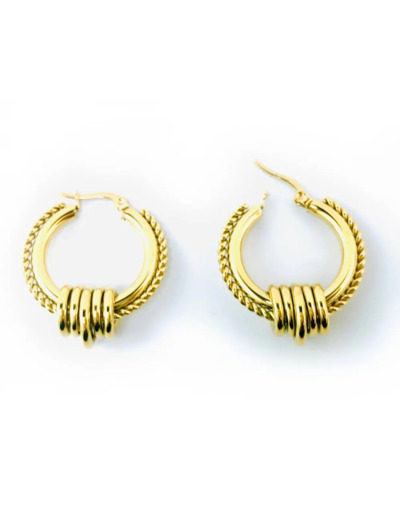 Ces bijoux d'oreille sont une création artisanale de Toimonbijou.fr et captivent immédiatement l'attention avec leur design élégant. Les créoles en or balinaises présentent un anneau strié, sublimé par cinq mini anneaux qui ornent le bas de la structure principale. Ce modèle unique apporte une touche féminine et sophistiquée à n'importe quelle tenue.