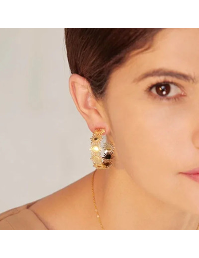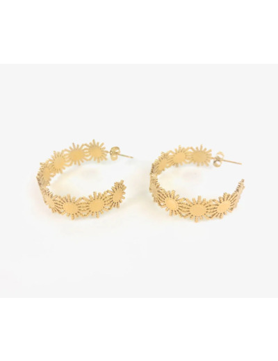 Ces créoles sont un véritable hommage à la lumière et à l'élégance. Chaque boucle est ornée de motifs solaires délicatement ajourés, qui se déploient autour d'un anneau doré. Ce design unique et lumineux capte magnifiquement la lumière, ajoutant une touche de brillance à chaque mouvement. Idéales pour un style à la fois audacieux et raffiné, ces boucles créoles sont le choix parfait pour celles qui souhaitent se démarquer avec un bijou tendance. Actuellement disponibles en ligne, elles sont proposées à un prix attractif, une véritable aubaine pour sublimer votre collection de bijoux.