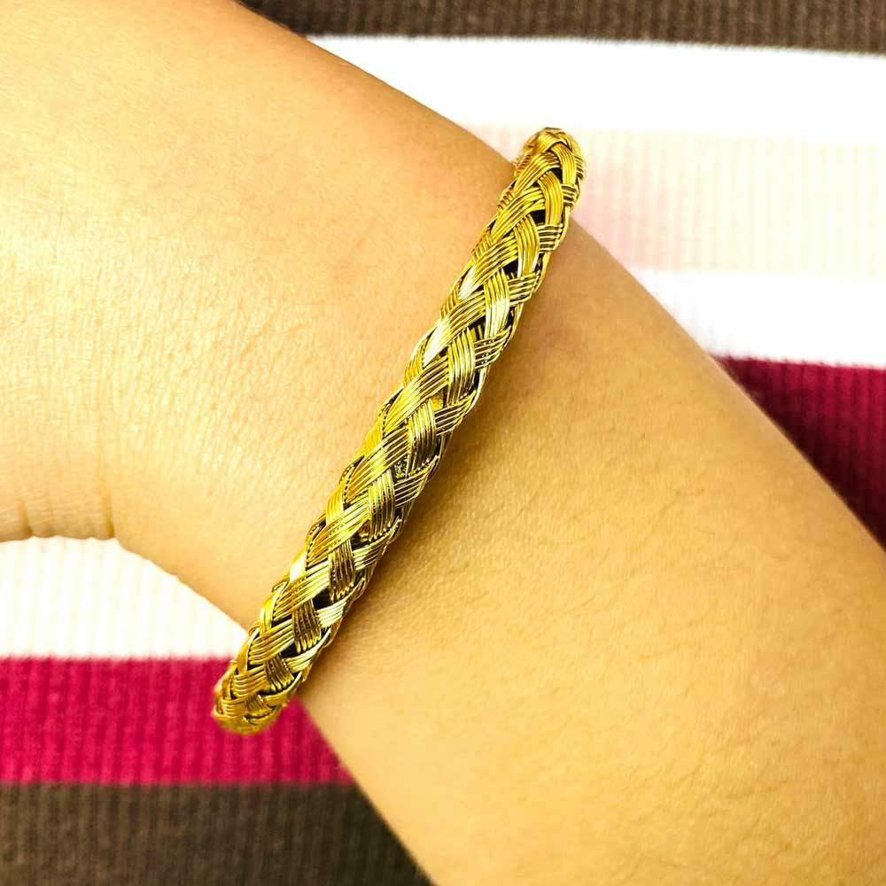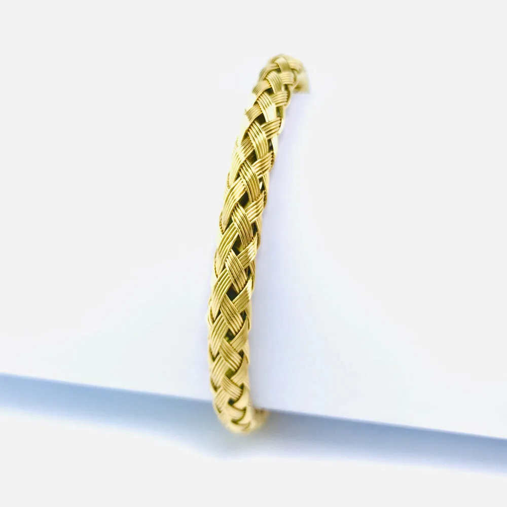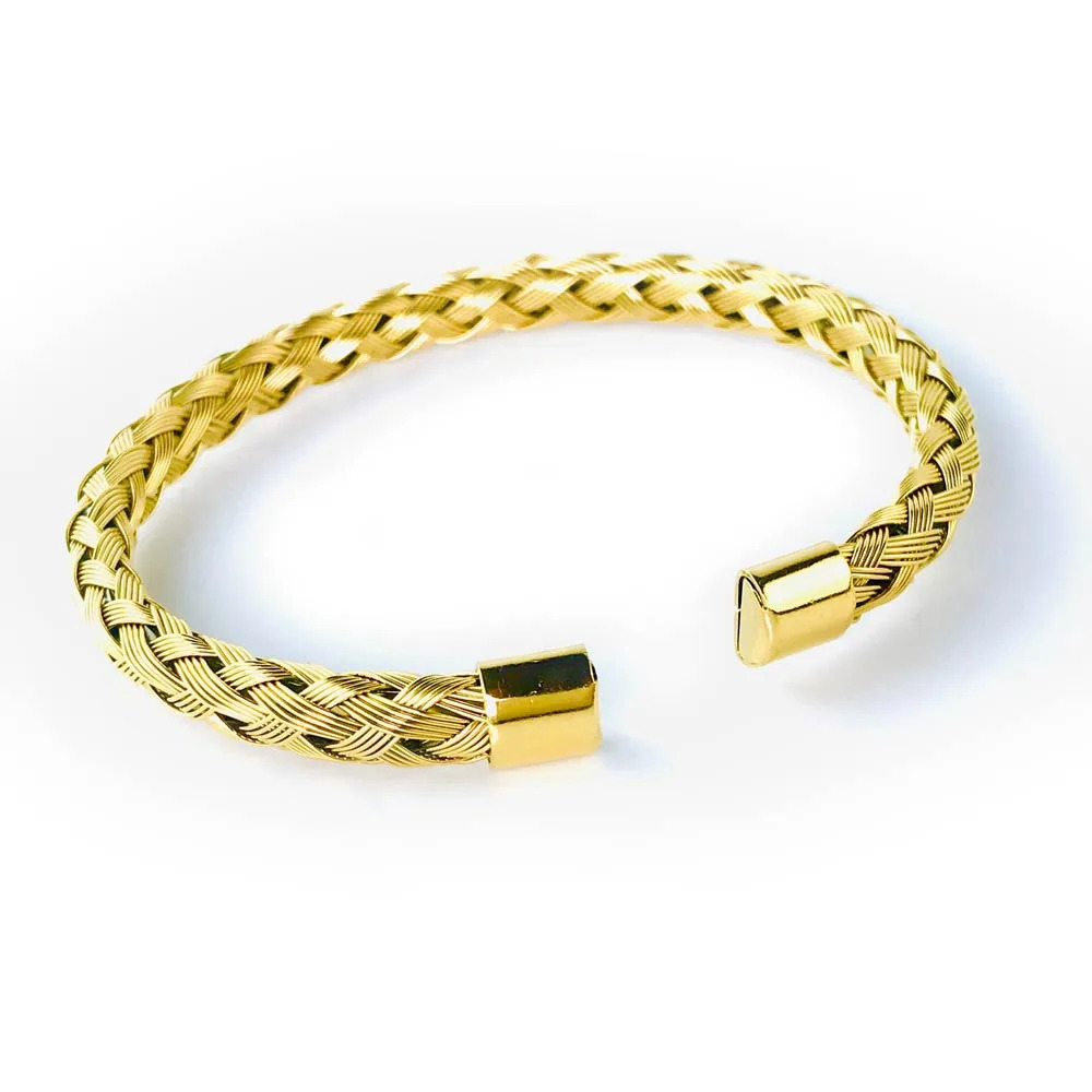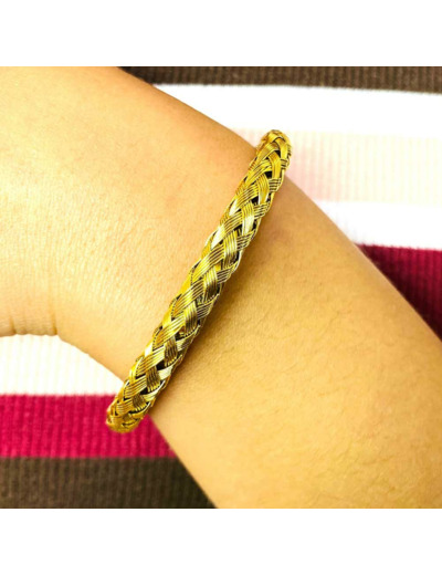 Un bracelet jonc ouvert en acier inox doré plaqué or fin 18 carats. Ce modèle convient à la fois aux hommes et aux femmes et a été conçu par notre créateur. Son design ajouré et sa texture en maille corde apportent une esthétique particulière à ce bijou. Avec une épaisseur de 5 mm et un diamètre de 6,5 cm par 6 cm, ce bracelet est à la fois léger et agréable à porter. Il est également une idée cadeau qui pourrait plaire à un être cher. Commander ce bijou est simple et rapide à partir de notre bijouterie en ligne. Ce bracelet ajoute une touche élégante à n'importe quelle tenue et peut être porté en toute occasion.