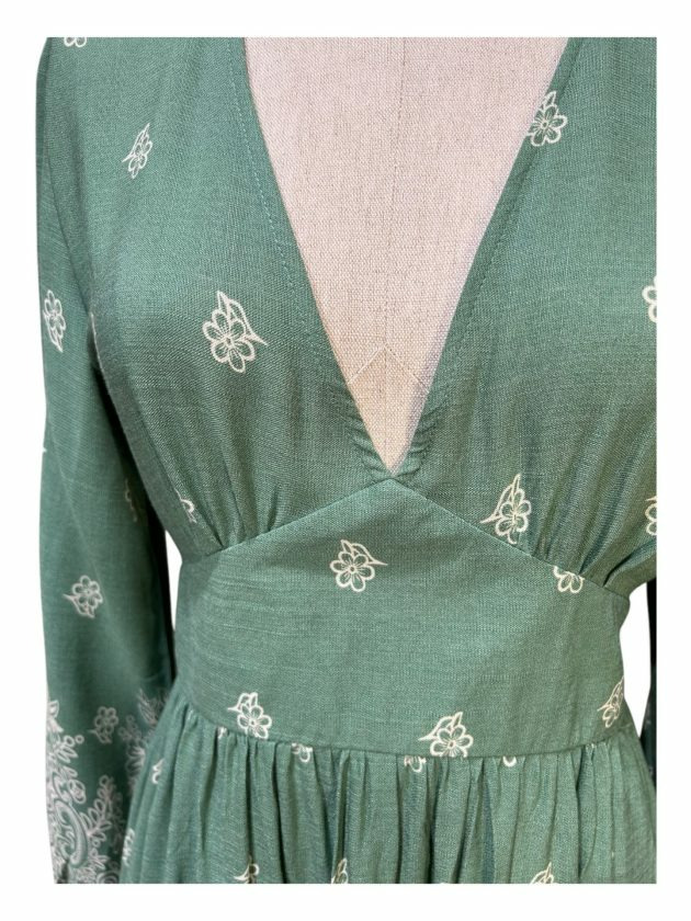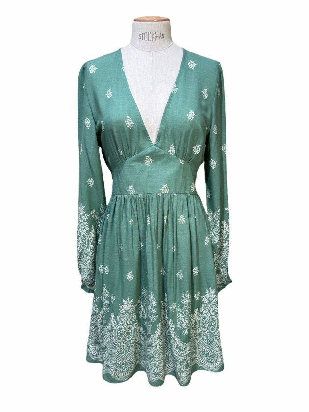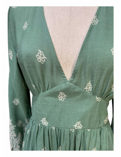Robe courte fluide, manches longues avec élastiques aux poignées, col V. Cette robe est smockée au dos et marquée à la taille sur le devant. Elle est doublée d'un jupon.