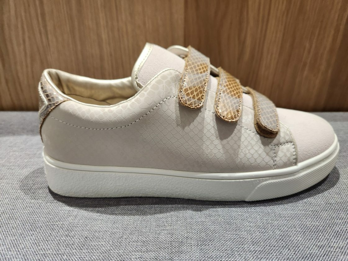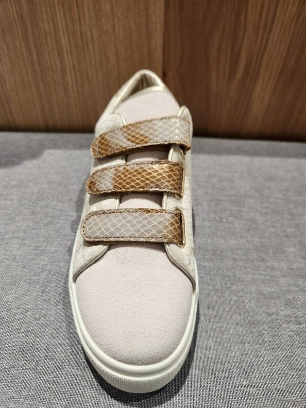 Les fermetures à velcro, qui remplacent les lacets traditionnels, sont stratégiquement placées sur le dessus de la chaussure pour assurer un ajustement parfait et rapide. Les velcros sont dans des tons beige et marron, créant une harmonie discrète avec la couleur générale de la chaussure tout en ajoutant un accent de contraste subtil. Ces velcros offrent un maintien sécurisé tout au long de la journée.