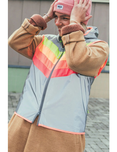 Le gilet présente des couleurs arc-en-ciel fluorescentes à l'avant et à l'arrière, avec une finition à l'ourlet corail fluorescent. Il est fabriqué en 100 % polyester et est lavable à 30°C (à l'envers).