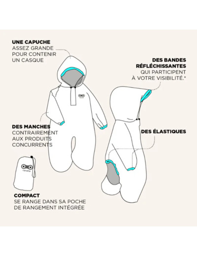 Les manches suffisamment larges couvrent même un manteau pour garder tout le corps de l'enfant ou le bébé au sec, mêmes ses pieds, par tous les temps. La capuche spacieuse est également conçue pour contenir un casque de vélo, assurant ainsi une double garantie en cas de pluie inattendue. De plus, cet imperméable dispose d'une poche intégrée, afin d'avoir un système de rangement pratique et simple à transporter.